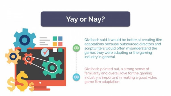 게다가 장편 영화를 제작하는 것은 단지 영화를 만드는 기술적인 지식 및 기술 그 이상이 것들을 필요로 한다. 이러한 측면에서도, 게임 산업에 대한 강한 친근감을 가진 주체가 좋은 비디오 게임 기반의 영화 각색을 담당하는 것이 더 나은 효과를 만들어낼 수 있다.