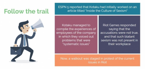 이번 파업은 비교적 최근에 발생한 사실이지만, 라이엇이 그동안 행해 온 직장 내 성차별 관행은 이미 지난해부터 제기되었다. 당시 ESPN5는 게임 웹진인 코타쿠가 라이엇 내부에서 공공연하게 발생하는 성차별 문화에 대한 기사를 인용했다.