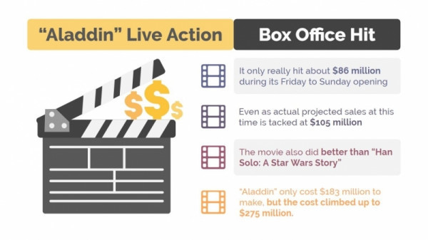 포브스의 보도에 따르면 '알라딘'은 북미 오프닝 8,600만 달러(약 1,025억 원)를 벌어들였다. 예상치였던 1억 500만 달러에는 조금 못 미치는 수준이었다. 그러나 영화를 보고 난 사람들의 반응이 긍정적이었다. 그러다보니 오프닝 주 이후에 입소문이 퍼졌다.