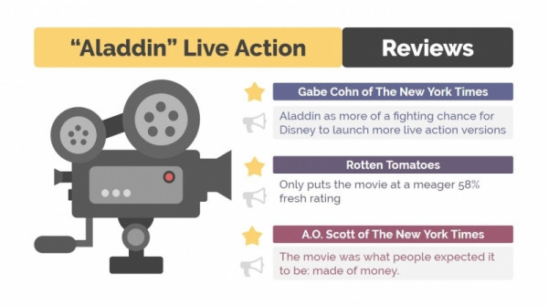한편 뉴욕 타임스의 케이브 콘은 "이번 '알라딘' 실사 영화의 성공은 앞으로 디즈니가 더 많은 실사 영화를 출시할 기회가 될 것이다. 로튼 토마토 등 평점 사이트에서 '알라딘'의 평점은 그리 좋은 수준이 아니지만, 실질적으로 박스 오피스에서는 '알라딘'이 큰 성공을 거두고 있다"고 말했다.