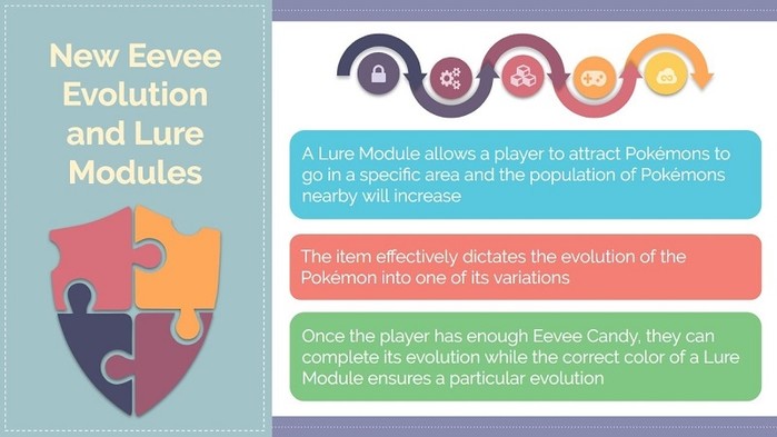 그러나 이브이를 진화시킬 때는 루어 모듈이 단순히 포켓몬을 끌어모으는 것 이상의 활약을 한다. 이 아이템은 이브이 진화 시 속성을 특정한다.