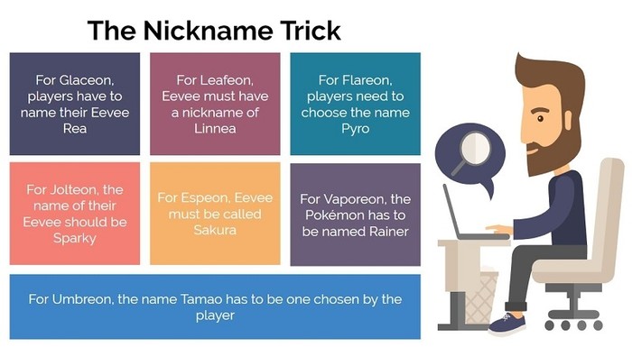 루어 모듈을 사용하지 않고도 이브이를 원하는 포켓몬으로 진화시킬 방법이 있다. 초창기부터 '포켓몬 고' 플레이어들 사이에서는 꽤 유명했던 이름 바꾸기 트릭이다.