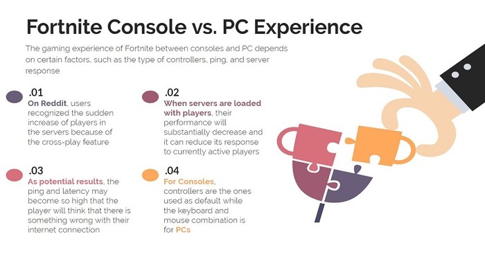 '포트나이트'를 플레이할 때 콘솔과 PC 간의 게임 경험은 컨트롤러 유형, 핑 및 서버 응답 등 특정 요인에 따라 달라진다. 크로스 플레이 기능으로 인해 서버의 플레이어가 갑자기 증가한다면 플레이어들의 게임 경험이 저하될 수 있다.