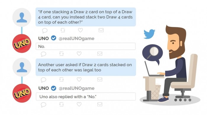 트위터 사용자들은 우노의 공식 계정과 상호 작용하며 즐거워했다. 그리고 우노 게임이나 우노의 규칙을 잘 몰랐던 사람들은 때 아닌 온라인 우노 토론 현장에서 우노에 대해 배우게 됐다.