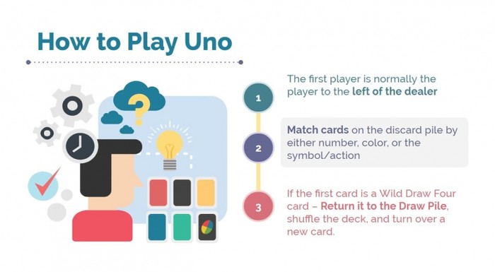 우노는 규칙이 매우 간단하고 이해하기 쉽다. 대중적인 게임인 '원카드' 게임과 비슷하다. 우선 누가 가장 먼제 플레이를 시작할지 정해야 한다. 일반적으로 플레이를 시작하는 사람은 딜러의 바로 왼쪽에 앉은 사람이다. 가족이나 친구들끼리 게임을 플레이한다면 나이 순서 혹은 가위바위보로 정한 순서대로 플레이하면 된다.