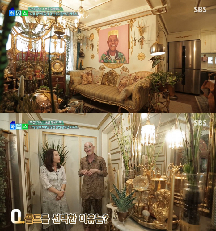 실제 황재근 집은 장식품부터 방문까지 곳곳이 전부 황금색으로 도배돼 있었다. 엔틱한 가구들과 황금빛 인테리어가 마치 궁전을 연상케한다. 황재근은 “17평으로 큰 집은 아니지만 내 생애 첫 집이다. 전에는 6.5평 원룸에 살았다”며 “골드를 선택한 이유는 앤틱 가구를 좋아한다. 기본적으로 앤틱과 골드가 잘 어울리기도 하고 개인적으로도 골드 톤을 선호한다”고 설명했다.