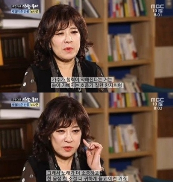 지난 2017년 ‘사람이 좋다’에 출연한 노사연은 약해진 청력으로 보청기를 착용중에 있다고 고백한 바 있다. 이날 노사연은 “가수가 청력이 약해진다는 것은 숨이 가빠지는 호흡 환자처럼 좌절도 느낀다. 귀가 안 좋다는 걸로 동정 받기 싫다”며 속내를 드러냈다.