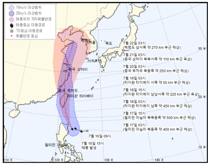 이후 내일인 18일에는 5호 태풍 다나스가 타이완 타이베이 남쪽 약 450km 부근 해상에 머물 것으로 예상된다. 우리나라에 5호 태풍 다나스가 영향을 주는 날은 22일로 오후 10시 정도로 백령도 남서쪽 약 270km 해상 부근에 자리할 것으로 보인다.