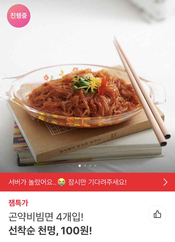 오늘 밤 9시 오픈된 ‘100원 잼특가’는 앱에서 참여할 수 있다. 앱에 접속한 뒤 ‘스크래치로 100원 받고 0000 곤약비빔면 공짜로 득템’을 클릭한 뒤 암호를 입력하면 된다.