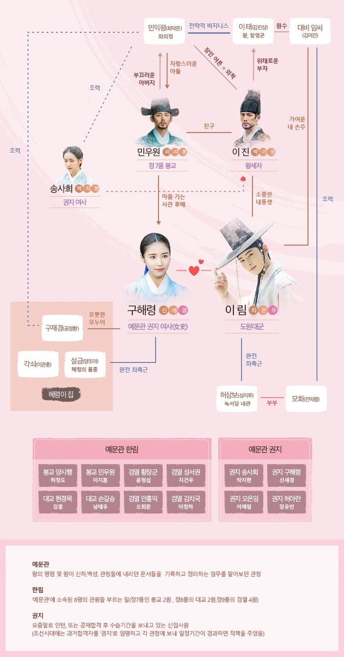 한편 MBC 수목드라마 '신입사관 구해령'은 위의 드라마와는 달리 로맨틱한 분위기를 형성한다. 조선의 첫 문제적 여사인 구해령 역을 맡은 신세경과 반전 모태솔로 왕자 이림 역을 맡은 차은우의 비주얼이 돋보이는 드라마라고 할 수 있다. 드라마 '신입사관 구해령'은 총 40부작이다.