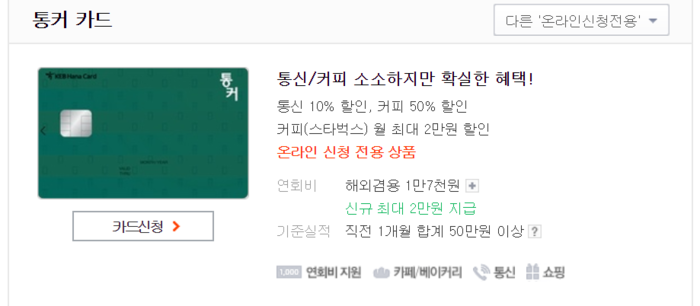 또한 하나 통커카드를 사용하면 스타벅스에서 최대 50% 할인 혜택(월 만원)을, 온라인 쇼핑 5% 할인 혜택을 받을 수 있다.