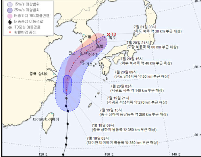 기상청의 태풍 다나스 예상 경로를 보면 7월 20일 오전 3시부터 서귀포 서쪽 약 140km 부근 해상에 위치한다. 이후 오전 9시에는 진도 남남서쪽 부근으로, 오후 3시에는 여수 북서쪽으로 이동하며 20일 오후 9시에는 포항 북동쪽으로 이동한다. 다음날인 21일 오전 3시에는 독도 북쪽으로 이동한다.