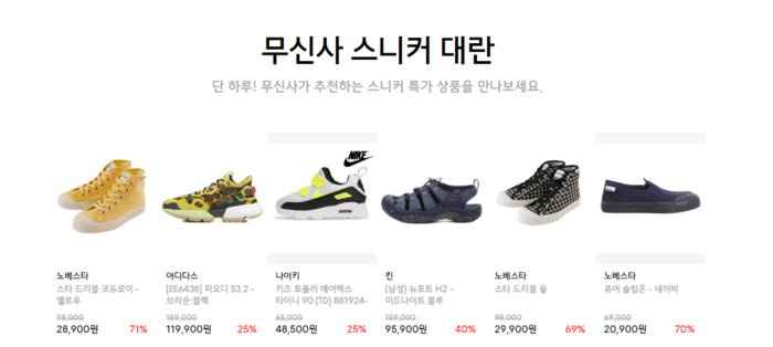 이후의 무신사 스니커 대란 타임특가는 정오와 오후 4시에 열린다. 정오에는 아디다스와 테바, 커버낫 등의 제품을, 오후 4시에는 버켄스탁, 반스 등의 제품을 한정 수량만큼 저렴한 가격에 선보일 예정이다.