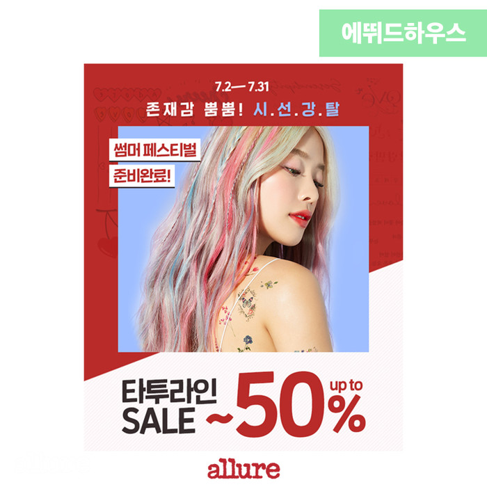 바캉스룩과 함께 매치하면 예쁜 타투 스티커, 바르고 5~10분 후면 아이돌 헤어로 변신하는 투톤 트리트먼트, 물놀이에도 지워지지 않는 초강력 타투 틴트까지 반값으로 할인해 큰 인기를 끌고 있다.