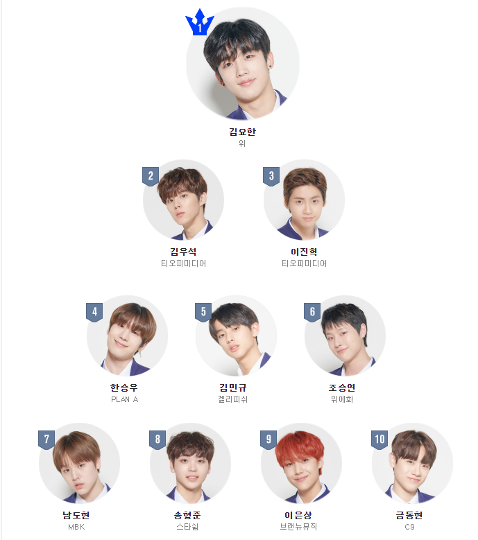 이어 프로듀스 x101 순위 2위는 김우석, 3위는 이진혁, 4위는 한승우, 5위는 김민규, 6위는 조승연, 7위는 남도현, 8위는 송형준, 9위는 이은상, 10위는 금동현이다.