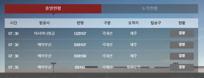 제주공항과 김해공항, 그리고 김포공항에서 출발하는 비행기들의 지연 및 결항 상태는 해당 공항 홈페이에서 확인 가능하다.