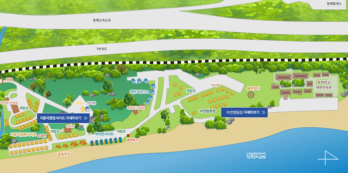캠핑장 안에는 현대식으로 설치된 공동샤워장을 비롯해 흡연부스도 따로 마련돼 있어 온 가족 여행지로 제격이다. 캠핑장 주변으로는 망상해수욕장을 비롯해 추암일출, 추암조각공원, 묵호항, 천곡황금박쥐동굴, 능파대, 용추폭포 등이 자리잡아 가볼만한곳도 많다.