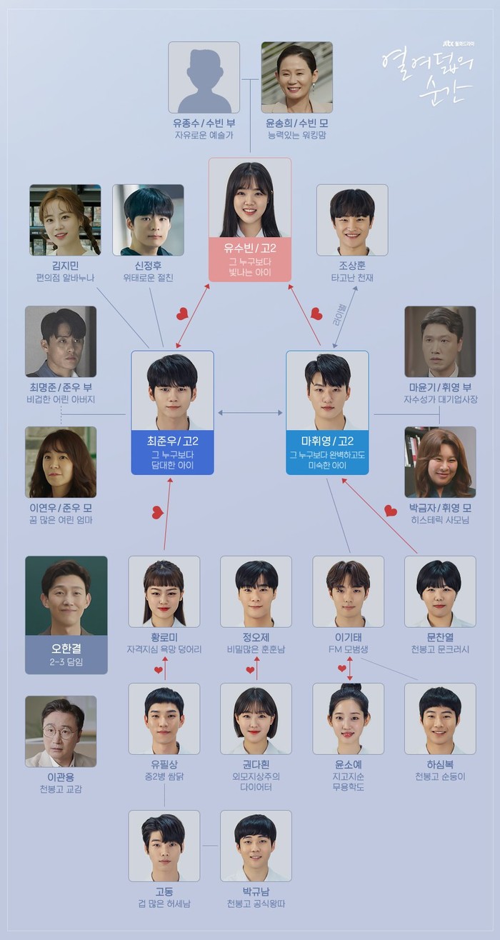 드라마 '열여덟의 순간'의 인물관계도에서는 옹성우와 신승호가 김향기를 두고 삼각관계를 이루고 있다. 이 외에도 옹성우와 신승호, 김향기가 다니는 천봉고 학생들과 학부모들 사이에서도 인물관계도가 복잡하게 얽혀 있다.