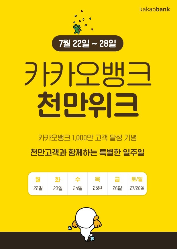 카카오뱅크는 1000만 고객 유치를 기념해 22일부터 일주일간 매일 색다른 이벤트를 제공한다. 다가오는 '카카오뱅크 천만위크' 이벤트로는 △화요일 체크카드 결제하면 CGV 영화관람권 △수요일 26주 적금 이자 2배 △목요일 해외송금 비용 완전 무료 △금요일 간편이체하면 나이키 맥스 △토요일·일요일 카카오의 특별한 혜택 등이다.