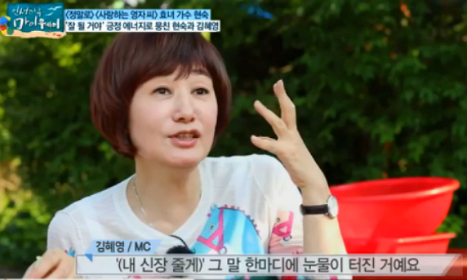 이어 “하루는 현숙 언니가 전화를 해서 ‘내가 너에게 신장을 하나 줄 수 있을 것 같다. 종합검진을 받아보니 내가 건강하다고 하더라’고 했다”며 “그 말을 듣는데 눈물이 펑펑 흘렀다. 수화기를 들고 서로 말없이 한참을 울었다”고 당시를 회상했다.