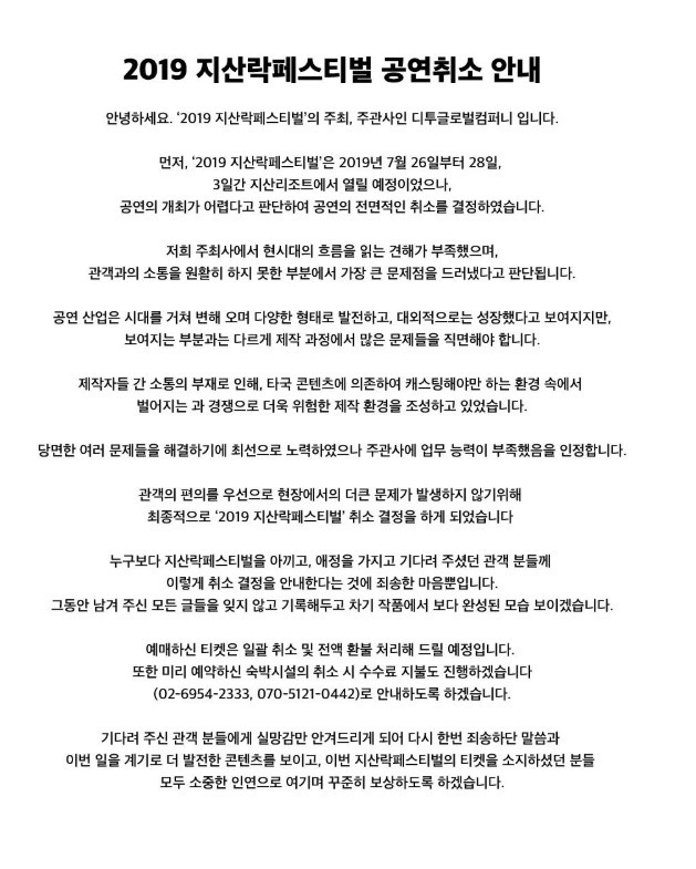 지산락페스티벌 홈페이지에는 2019 지산락페스티벌 공연취소 안내에 대해 "26일부터 28일 3일간 지산리조트에서 열릴 예정이었으나 공연의 개최가 어렵다고 판단패 공연의 전면적인 취소를 결정하였습니다"라며 "저희 주최사에서 현시대의 흐름을 읽는 견해가 부족했으며 관객과의 소통을 원할히 하지 못한 부분에서 가장 큰 문제점을 드러냈다고 판단됩니다"라고 적었다. 이어 지산락페스티벌 공연취소 안내 전문은 다음과 같다.