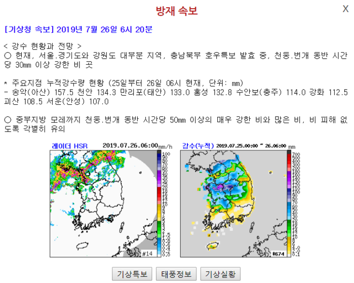 현재 호우경보가 발효된 것은 인천(강화), 강원도(강원북부산지, 철원), 경기도(파주, 양주, 고양, 포천, 연천, 동두천, 김포)이며, 호우주의보가 발표된 곳은 인천(강화군 제외), 서울, 충청남도(당진, 서산, 태안, 아산, 천안), 강원도(강원중부산지, 양구평지, 정선평지, 평창평지, 홍천평지, 고성평지, 인제평지, 횡성, 춘천, 화천, 원주, 영월), 서해5도, 경기도(여주, 안산, 화성, 군포, 성남, 가평, 광명, 양평, 광주, 안성, 이천, 용인, 하남, 의왕, 평택, 오산, 남양주, 구리, 안양, 수원, 의정부, 부천, 시흥, 과천) 등이다.