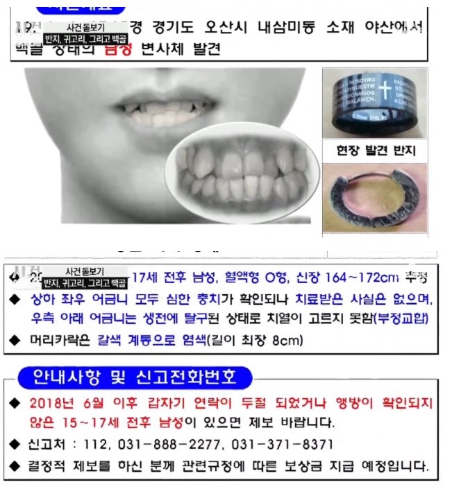 오산경찰서장이 작성한 신원불상 변사자 '오산 백골 변사체' 공개수배 내용에 따르면 오산 백골 변사체는 15~17세로 보이는 신장은 164∼172㎝ 남성의 시신으로 상하 좌우 어금니 모두 심한 충치가 확인되나 치료받은 사실은 없다. 특히 우측 아래 어금니는 생전에 탈구된 상태로 치열이 고르지 못한 부정교합 상태다. 오산 백골 변사체의 머리카락은 갈색 계통으로 염색됐고 길이는 최장 8㎝였을 것으로 경찰은 추정하고 있다.