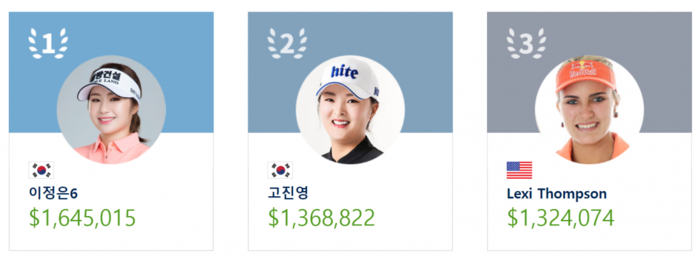 현재 lpga 상금 순위를 보면 1위는 이정은6로 상금은 총 164만 5015원, 2위는 고진영으로 136만 8822원, 3위는 렉시 톰슨으로 132만 4074원이다.