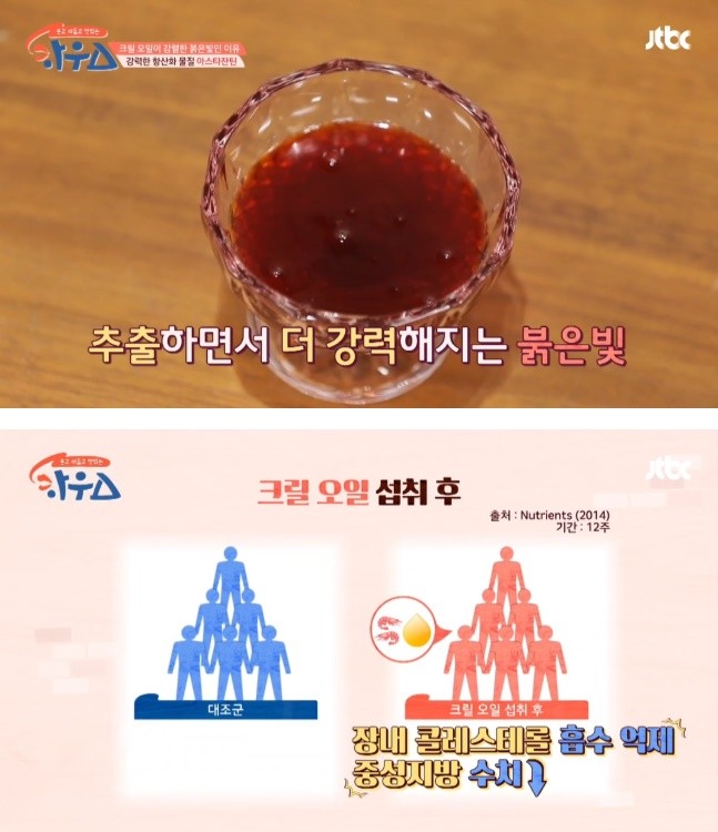 또한 크릴오일은 ‘염증에 좋은 식품’이다. 바로 크릴오일 속 ‘아스타잔틴’ 성분 때문인데 크릴오일의 아스타잔틴은 유해한 활성산소의 생성을 막아준다. 대표적인 항산화 물질로 비타민C, 비타민E, 베타카로틴 등이 있으나 크릴오일 속 아스타잔틴의 항산화 능력은 비타민C의 65배, 베타카로틴의 54배, 비타민E의 14배다.