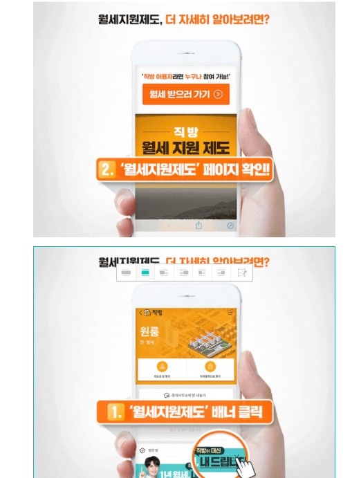 '직방 월세지원제도' 자세한 내용은 배너 클릭 후 월세지원제도 페이지를 확인하면 된다. '직방 월세지원제도' 신청방법은 블로그, 인스타그램, 페이스북 등에 후기를 작성하고 직방 앱을 통해 응모하면 된다.