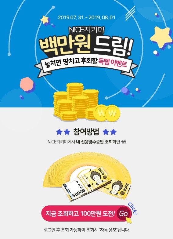 내달 1일까지 진행되는 ‘나이스지키미 백만원드림' 참여 방법은 나이스지키미에서 내 신용영수증만 조회하면 된다. 신용영수증은 신용등수, 대출정보, 신용카드 사용정보, 연체정보 등을 무료로 확인할 수 있다. 단, '나이스지키미 백만원드림'은 로그인 후 조회 가능하며 조회 시 자동 응모된다.