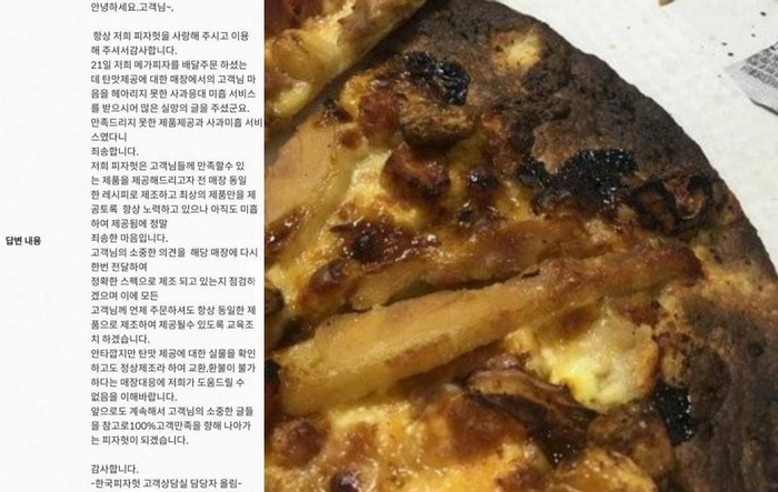 당시 공개된 피자헛 댓글에 따르면 “고객님께 언제 주문하셔도 항상 동일한 제조품으로 제조하여 제공될 수 있도록 교육조치하겠다”라며 “안타깝지만 탄 맛 제공에 대한 실물을 확인하고도 정상제조라 하여 교환, 환불이 불가하다는 매장 대응에 저희가 도움 드릴 수 없음을 이해바란다”고 말했다.