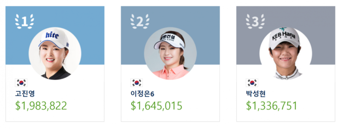 1위는 고진영으로 198만 3822달러, 2위는 이정은6으로 164만 5015달러, 3위는 박성현으로 133만 6751달러로 알려졌다.