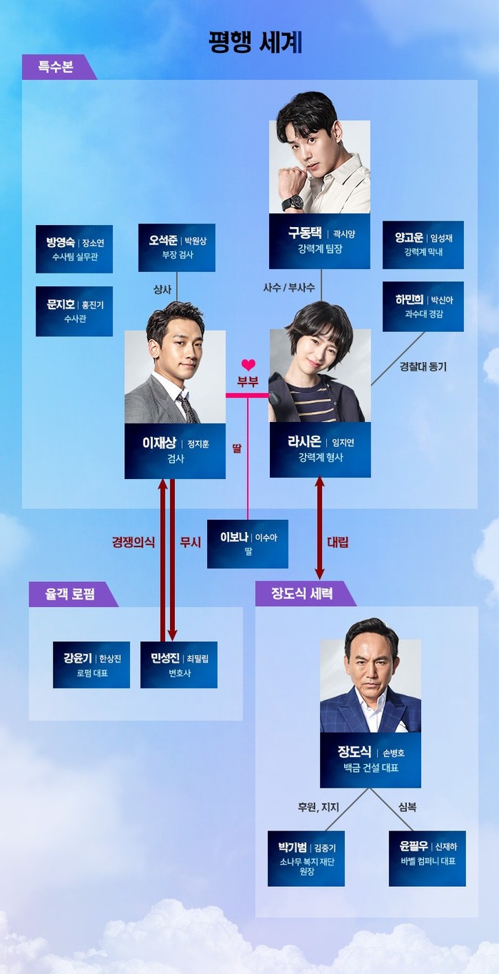 '웰컴2라이프'는 정지훈이 현실 세계에서 평행세계로 이동하기 때문에 현실세계와 평행세계의 인물관계도가 달라진다.