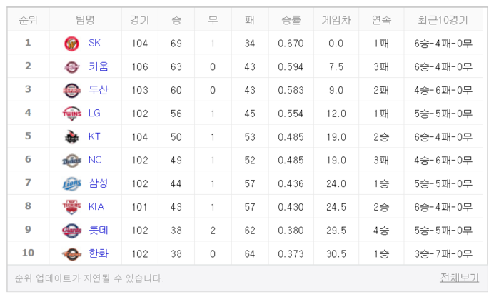 현재 2019 프로야구 순위 1위는 SK, 2위는 키움, 3위는 두산, 4위는 LG, 5위는 KT, 6위는 NC, 7위는 삼성, 8위는 기아, 9위는 롯데, 10위는 한화다.