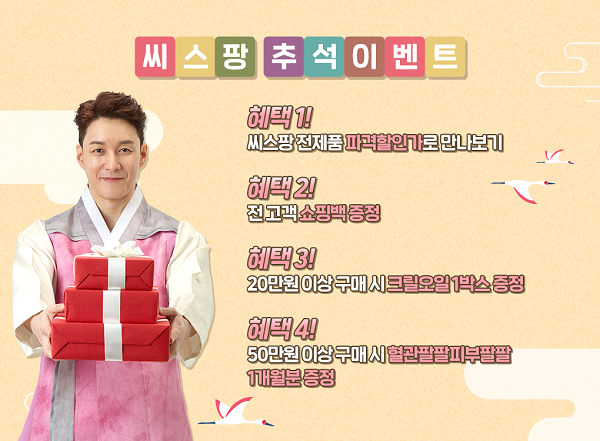 이번 추석 이벤트는 씨스팡 자사몰에서 8월 26일부터 9월 23일까지 진행되며, 각 구매 금액대별로 증정 이벤트를 함께 진행한다. 20만원 이상 구매 시 크릴오일 100 1박스를, 50만원 이상 구매 시 혈관팔팔피부팔팔을 1개월분 추가 증정한다.
